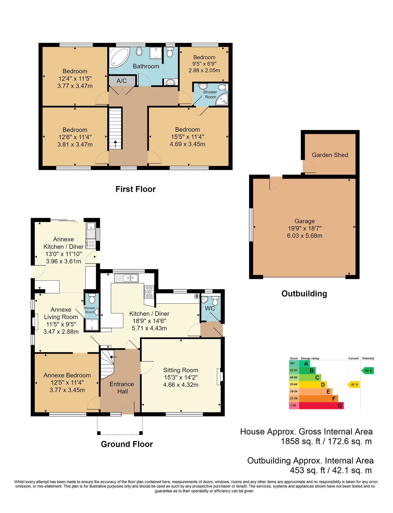 This detached family house offers a bright and welcoming sitting room, a kitchen/diner located at the rear that's perfect for family meals and entertaining, and a convenient downstairs WC. On the ground floor, a self-contained one-bedroom annexe provides flexibility, ideal for multi-generational living or visiting guests.