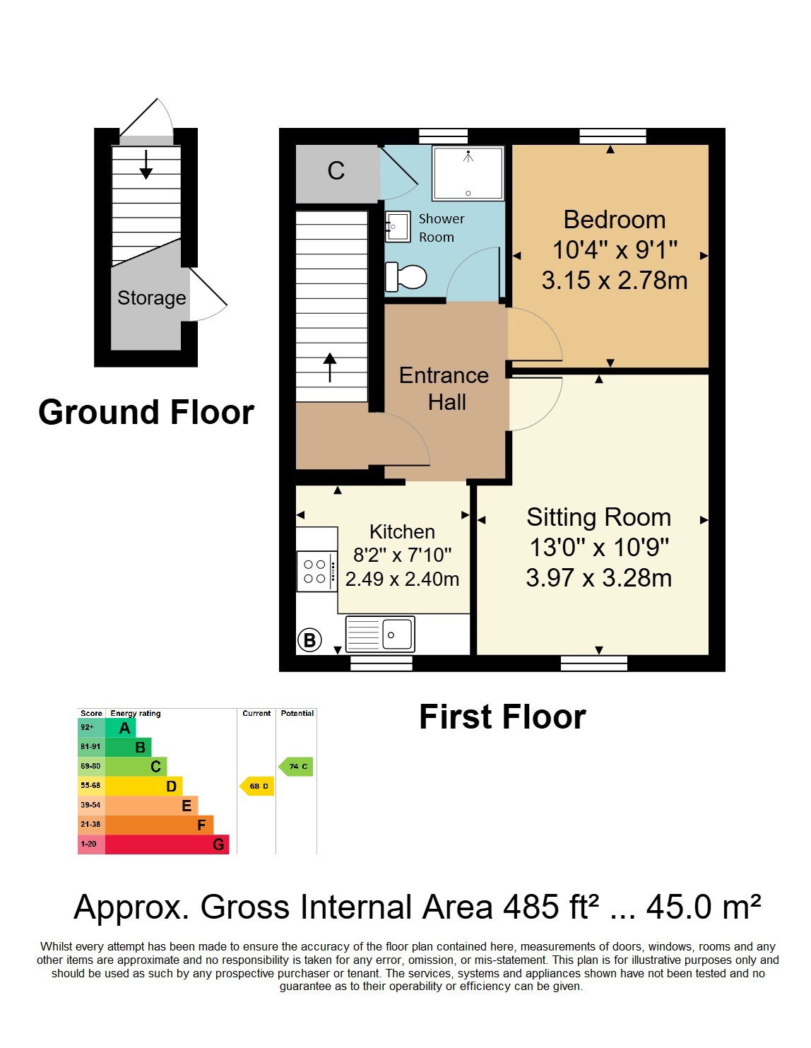 OUTSIDE: One allocated car parking space and outside storage area under the stairs