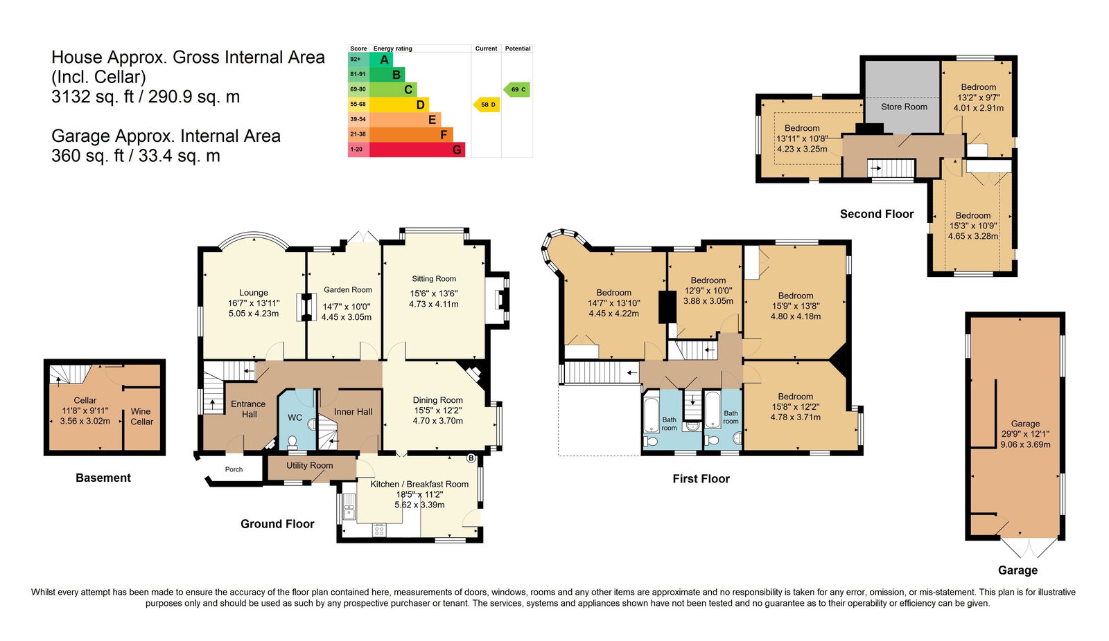 Porch - Entrance Hall - WC - Cellar - Lounge - Garden Room - Sitting Room - Dining Room - Kitchen/Breakfast Room - Utility Room - Seven Bedrooms - Two Bathrooms - Extensive Gardens - Garage - Off Road Parking