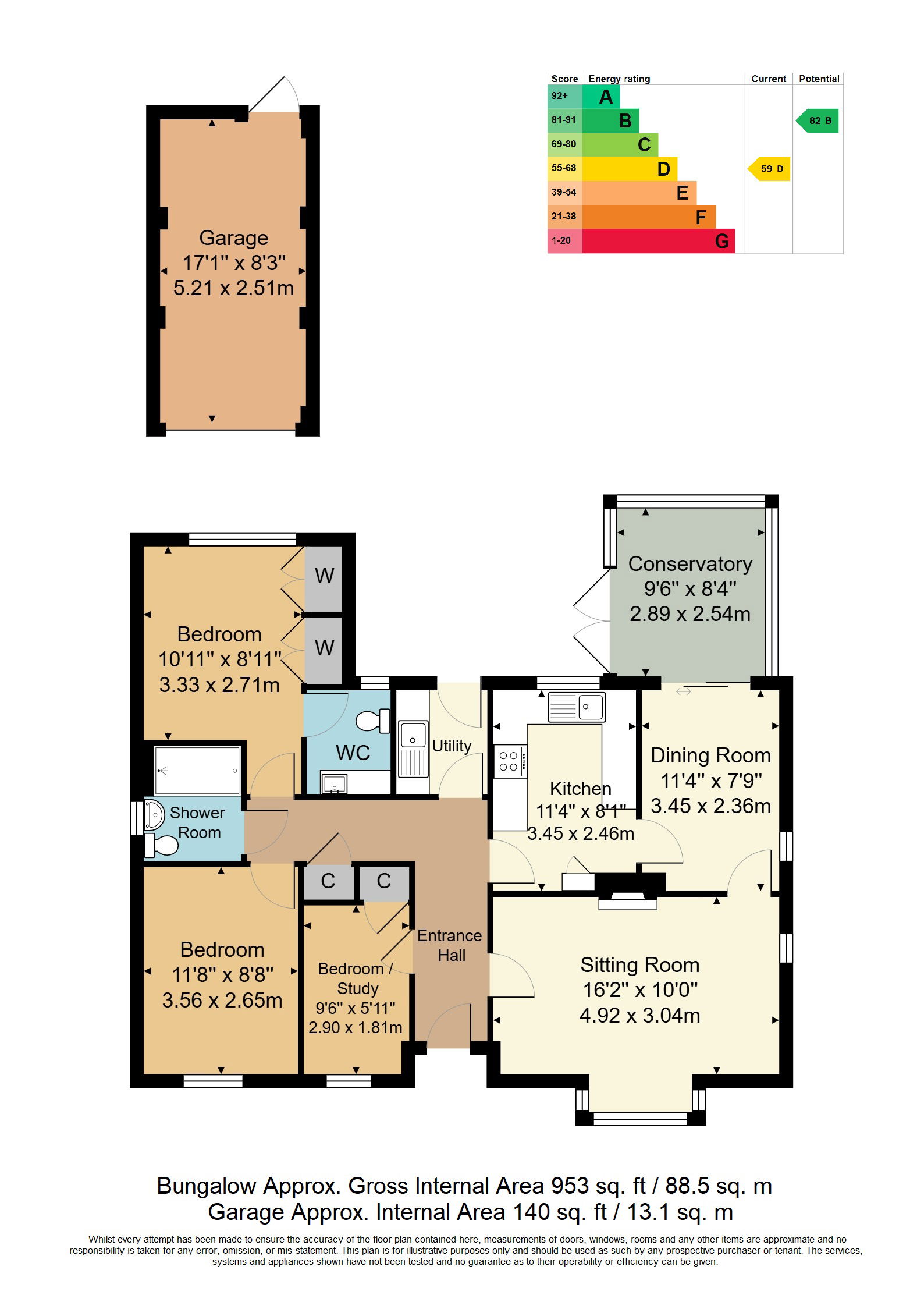 Entrance Hall - Sitting Room - Dining Room - Conservatory - Study/Bedroom 3 - Kitchen - Utility Room - Two Further Double Bedrooms - Bathroom - En-suite Washroom To Master Bedroom - Attractive Garden - Single Garage