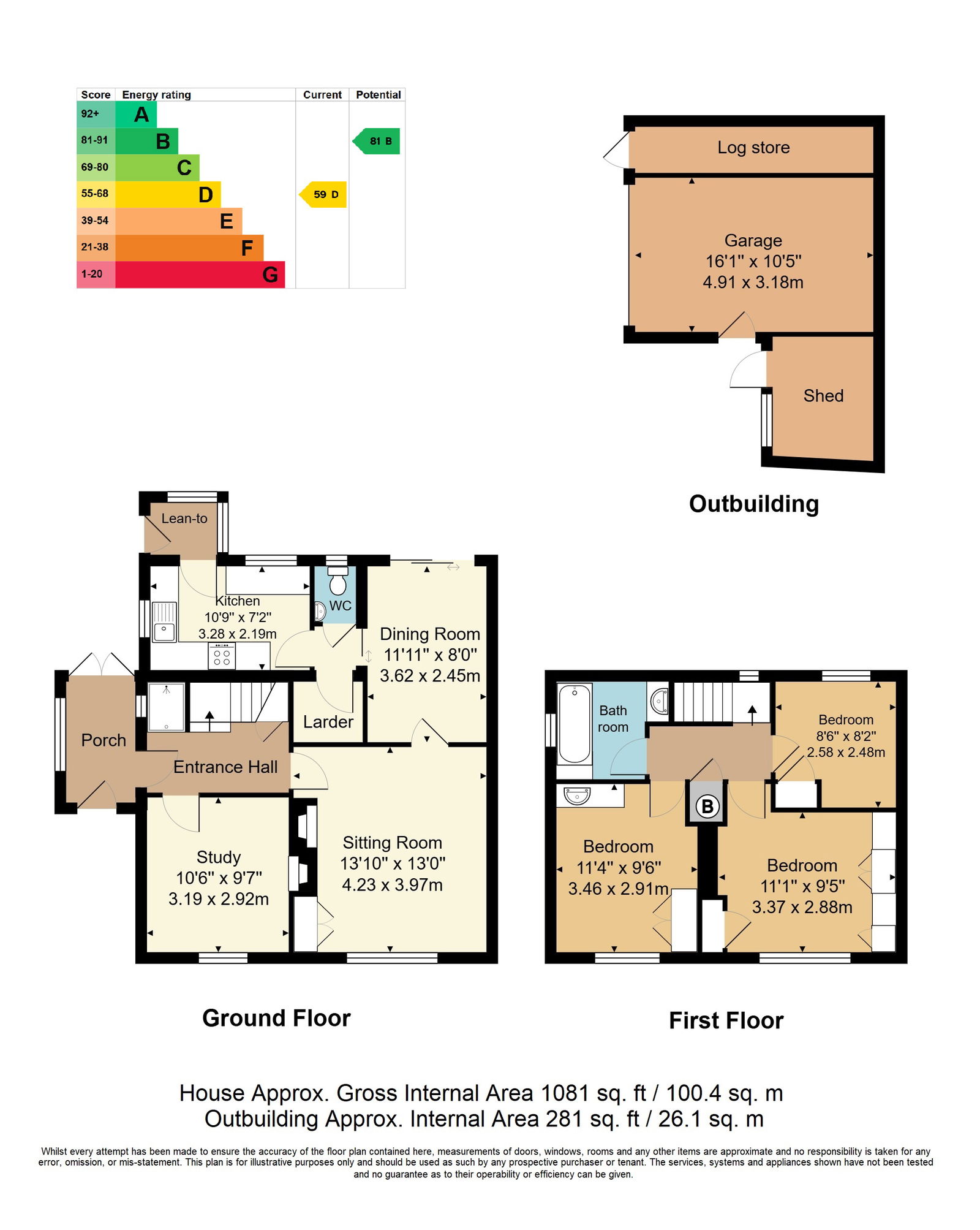 Set back from the road behind an attractive front garden and driveway is this charming family home. You enter via an attached porch, with space for both coats and shoes. The ground floor offers a study/reception room, and living room at the front of the house, whilst a dining room and the kitchen are both situated at the rear. Completing the ground floor is the useful separate cloakroom. Stairs to the first floor lead to a spacious landing where you will find the three bedrooms and family bathroom. Both the first and second bedroom are good sized doubles and come fitted with useful storage. Bedroom three is a spacious single bedroom or small double bedroom. Outside is the lovely rear garden with generous sized lawn, winding footpath and established trees, plants and shrubs. There is a useful summerhouse, storage shed and access to the garage and second driveway at the rear.