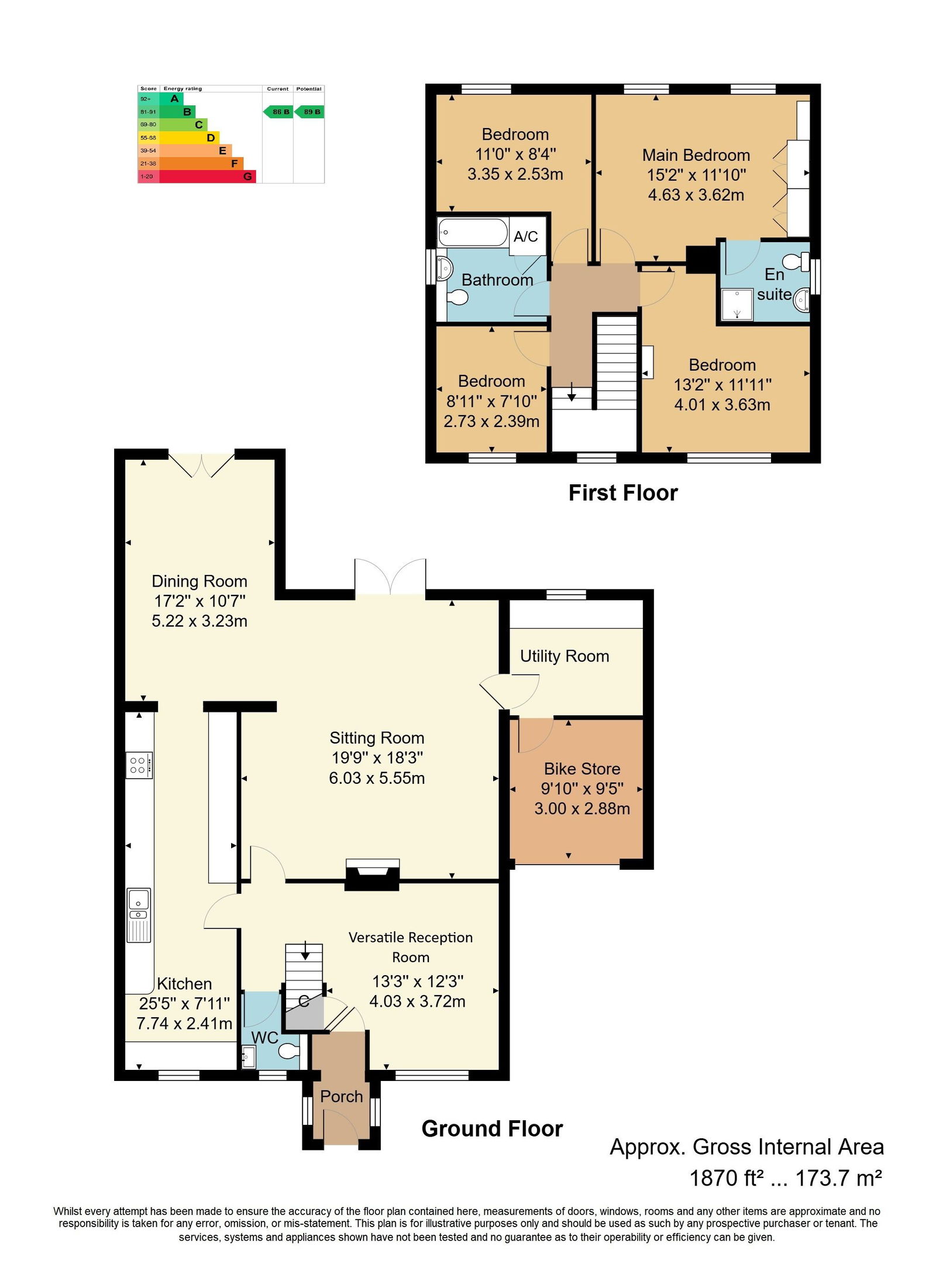 FAMILY BATHROOM: Panelled bath with Aqualisa remote controlled shower over with tiled surrounds and glass screen, low level wc, vanity wash hand basin with storage under. Storage cupboard with shelving and radiator, dual fed heated towel rail, tiled flooring and obscured window to side.