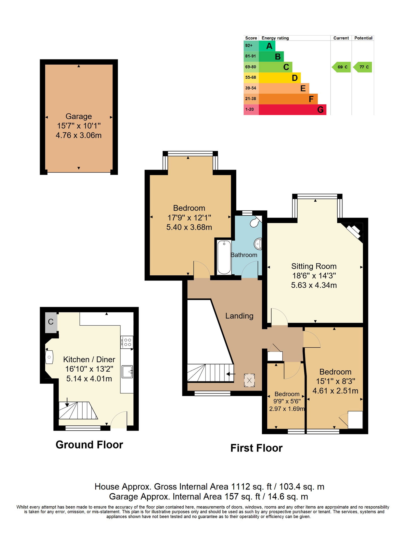Kitchen/Diner - Landing - Sitting Room - Three Bedrooms - Bathroom - Single Garage - Off Road Communal/Shared Parking - Southerly Facing Communal Gardens - Private Selection of Woodland with a Shepherds Hut