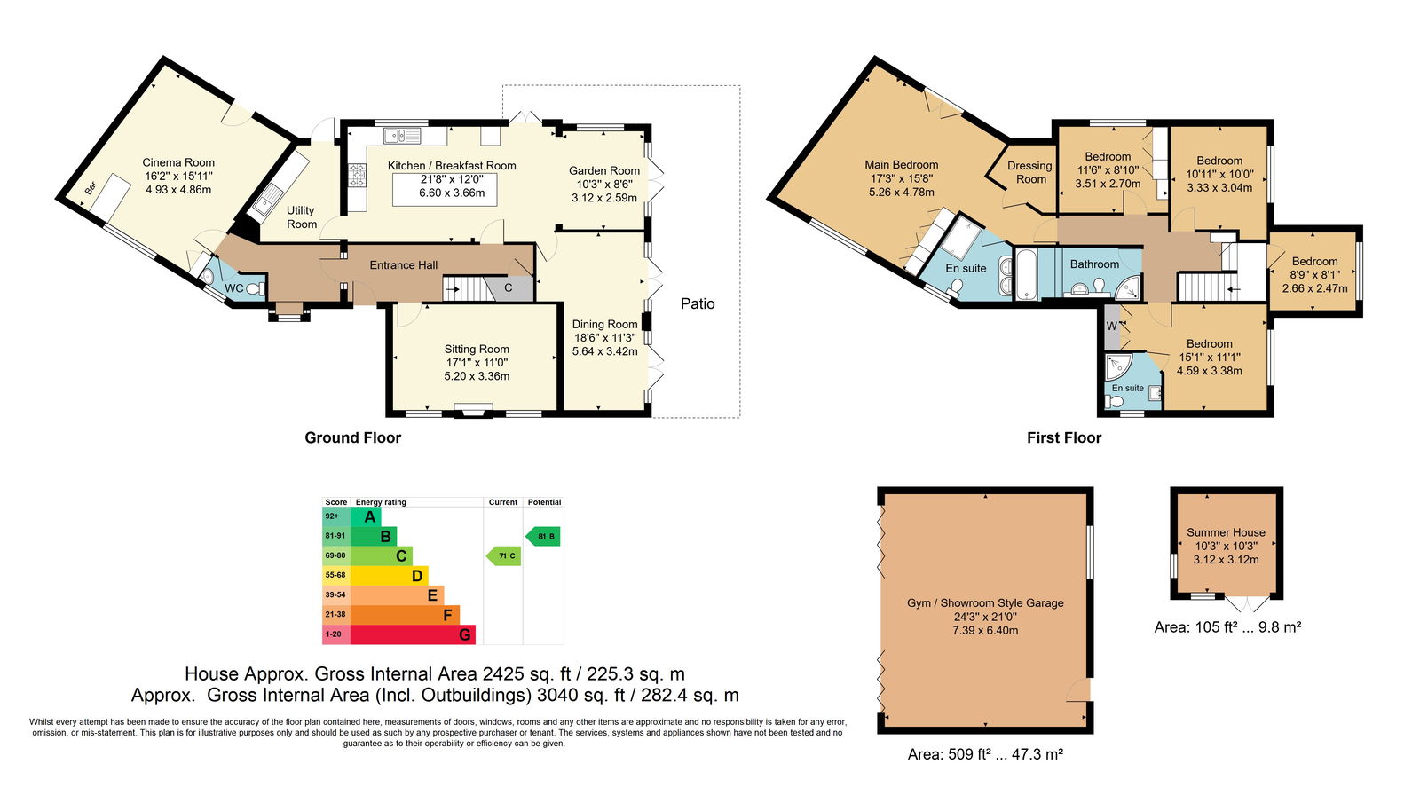 Open Porch - Entrance Hall - Sitting Room - Kitchen/Breakfast/Garden Room - Utility Room - Dining Room - Inner Hall - Downstairs Cloakroom - Cinema Room - Main Bedroom Suite With En Suite Shower Room and Dressing Room - Four Further Bedrooms - Second En Suite Shower Room - Family Bathroom - Detached Showroom Style Triple Garage - Off Road Parking - Large Private Rear Garden & Patio