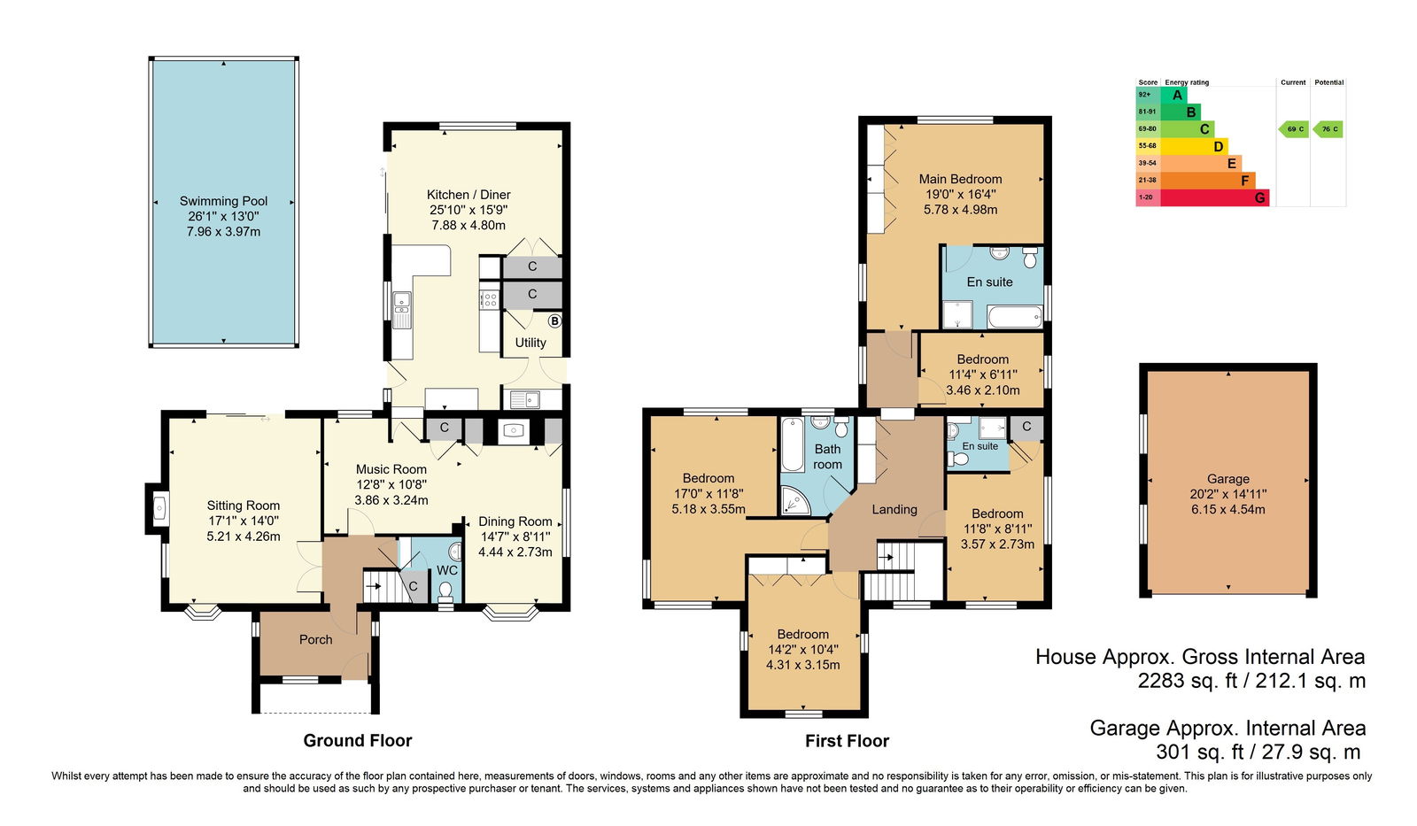 Entrance Porch - Entrance Hall - Inner Hall - Downstairs Cloakroom - Sitting Room - Music Room - Dining Room - Kitchen/Breakfast Room - Utility Room - Five Bedrooms - En Suite Bathroom - En Suite Shower Room - Family Bathroom - Front Garden With Off Road Parking & Double Garage - Off Road Parking - South Westerly Facing Rear Garden With Paved Patio & Swimming Pool