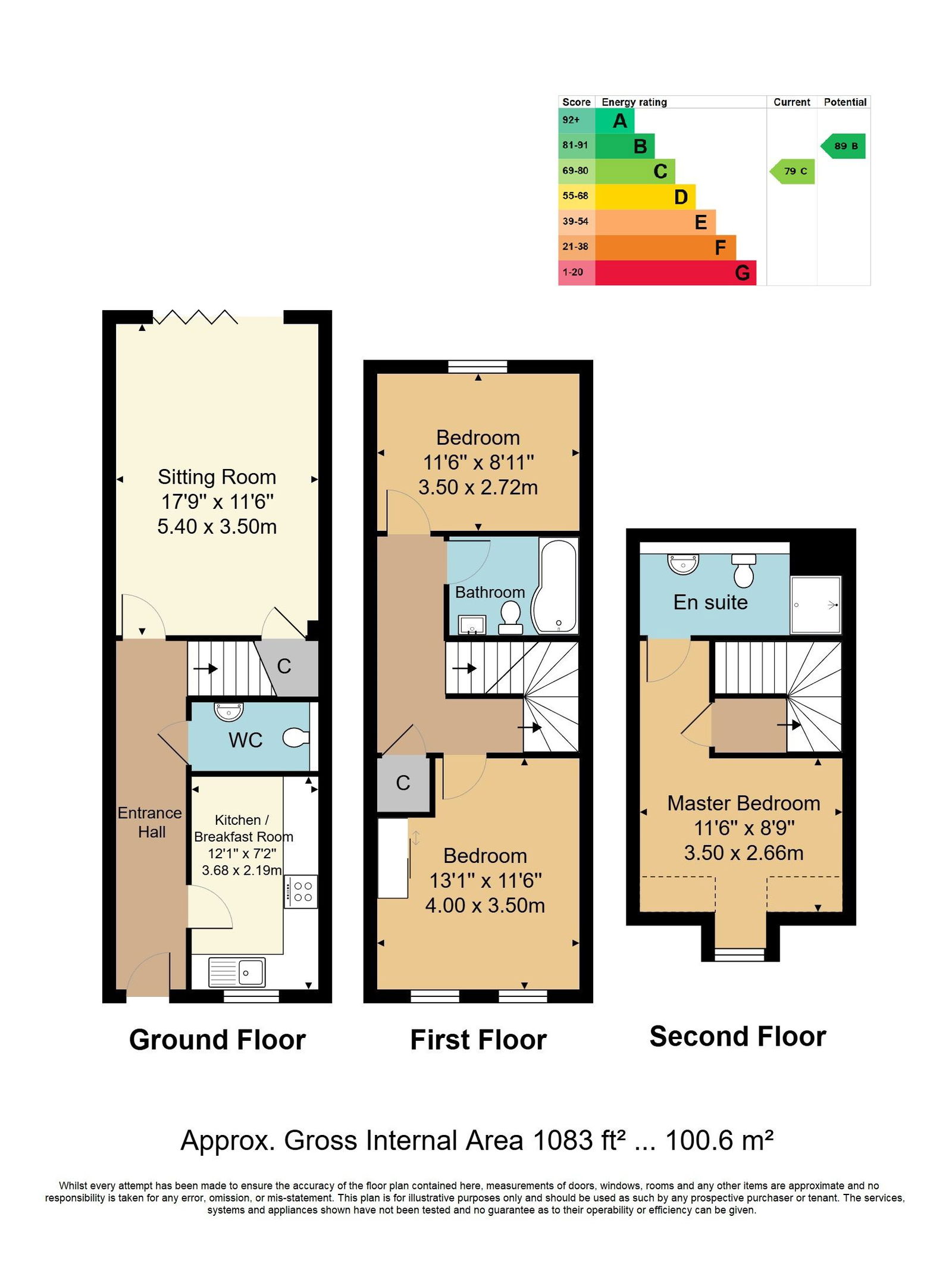 Modern three-storey mid-terrace house close to Crowborough town centre. Features include an entrance hall, modern kitchen/breakfast room, sitting room, and downstairs WC. The first floor offers two bedrooms (one with built-in wardrobes) and a family bathroom, while the top floor has a further bedroom with en-suite shower room. Front and rear gardens plus one allocated rear parking space.