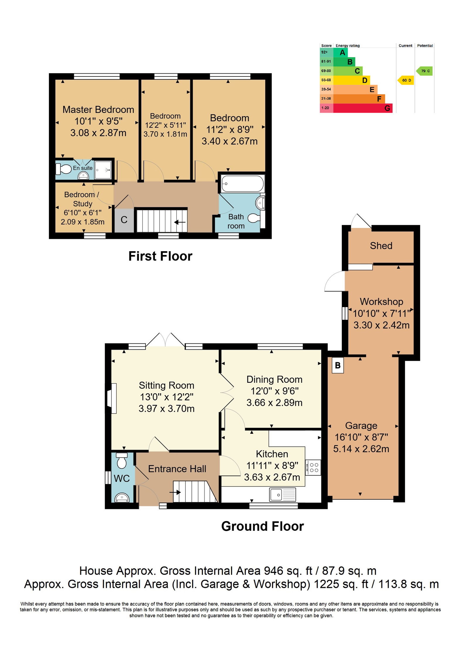 Covered Entrance Porch - Entrance Hall - Cloakroom - Sitting Room - Dining Room - Kitchen - First Floor Landing - Master Bedroom With Ensuite - Three Further Bedrooms - Bathroom - Garage & Driveway - Large Timber Workshop & Shed