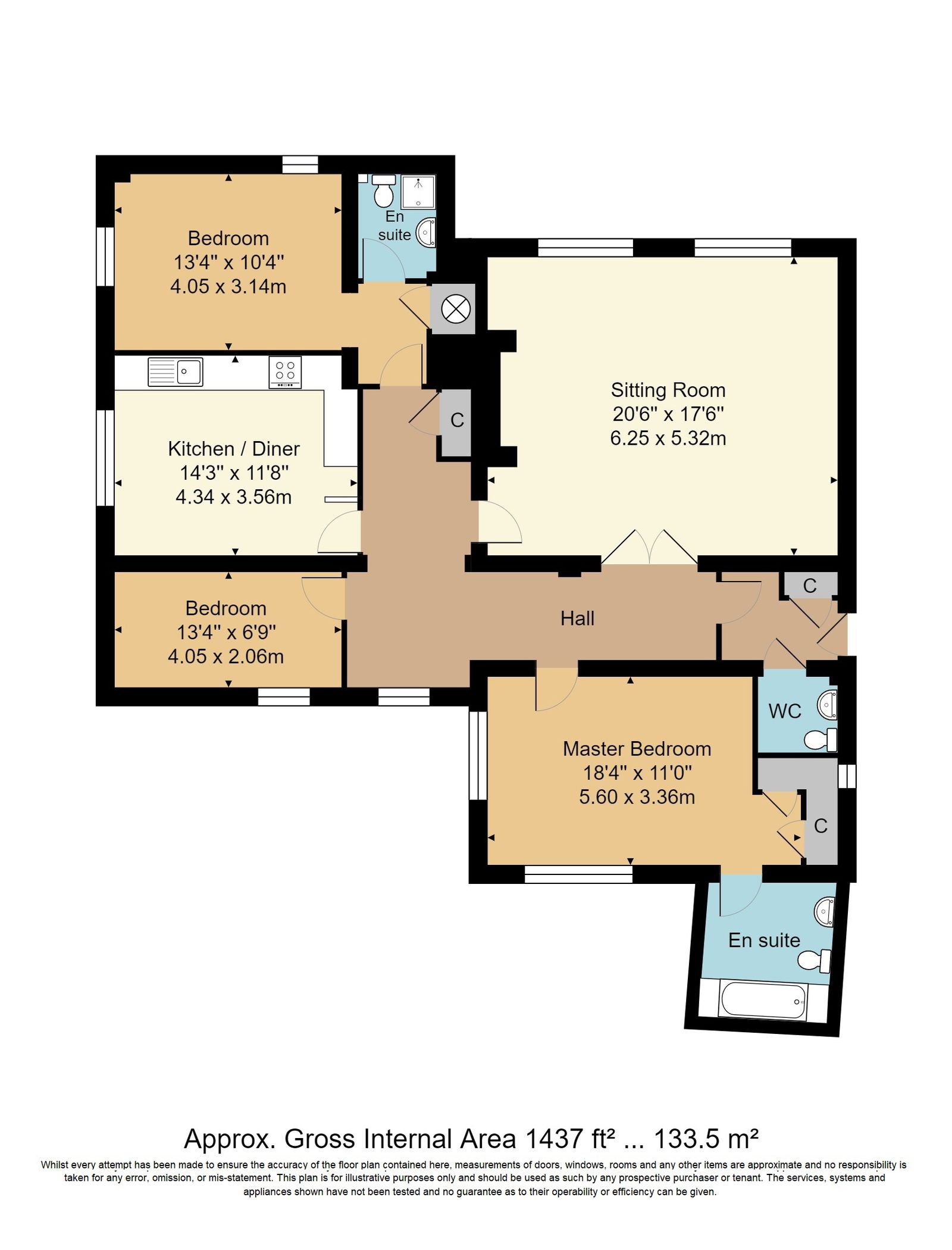 EN-SUITE: Fitted with a pedestal wash hand basin, corner shower cubicle, low level WC. Part tiling to walls, laminate flooring, heated towel rail, downlights, extractor fan. Built-in airing cupboard housing hot water tank.