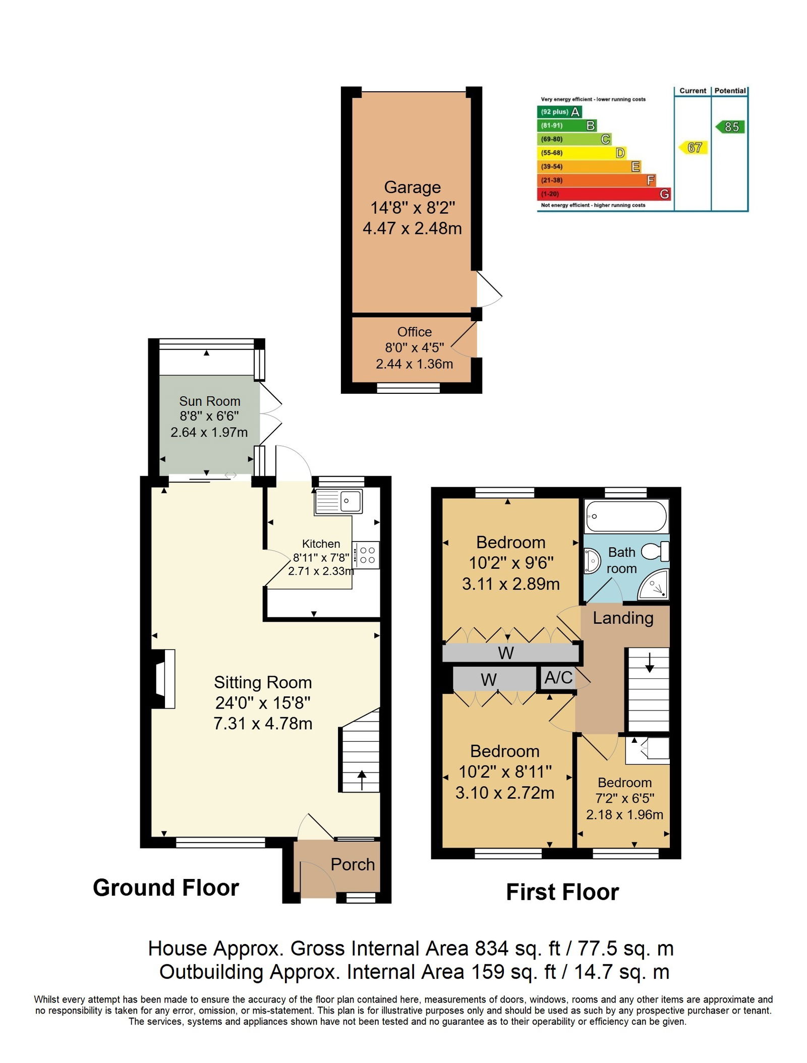 Sat back from the road behind a neat low wall and low maintenance front garden is this well presented family home. You step into a useful entrance porch with fitted storage and space for coats and shoes. From here, you enter into the spacious living/dining room with ample space for large sofas and a table and chairs. There is a wide window at the front along with a sliding door to the rear giving access to the sun room whilst also offering plenty of natural light. The sun room is a useful addition with French doors to the garden, fitted storage along with an electric heater and ceiling fan making it a room for all seasons. Completing the ground floor is the smart, newly fitted kitchen. The kitchen offers plenty of fitted cabinets with brushed gold handles along with attractive wood effect work tops. There is an integrated fridge/freezer, oven and grill along with induction hob and extractor. Additional space is available for a washing machine and dishwasher. Climbing the carpeted stairs to the first floor you are welcomed with a spacious landing with fitted airing cupboard and access to the loft. The main bedroom is at the rear of the house and looks onto the garden. It has plenty of space for a large double bed and benefits from three double fitted wardrobes. Bedroom two is another double bedroom and is at the front of the house, again with fitted wardrobes. The third bedroom is a single room with a fitted wardrobe and again is at the front of the house. The family bathroom completes the first floor and has a fully fitted suite to include a bath with shower attachment, separate walk-in shower, wash basin, WC and chrome heated towel rail. Ouside the low maintenance, West facing garden offers a mixture of patio space and artificial lawn. There is a gate to the side giving access to the driveway whilst there is also access to the home office and garage. At the rear of the house and accessed from the garden and driveway to the side is the allocated parking space and garage.
