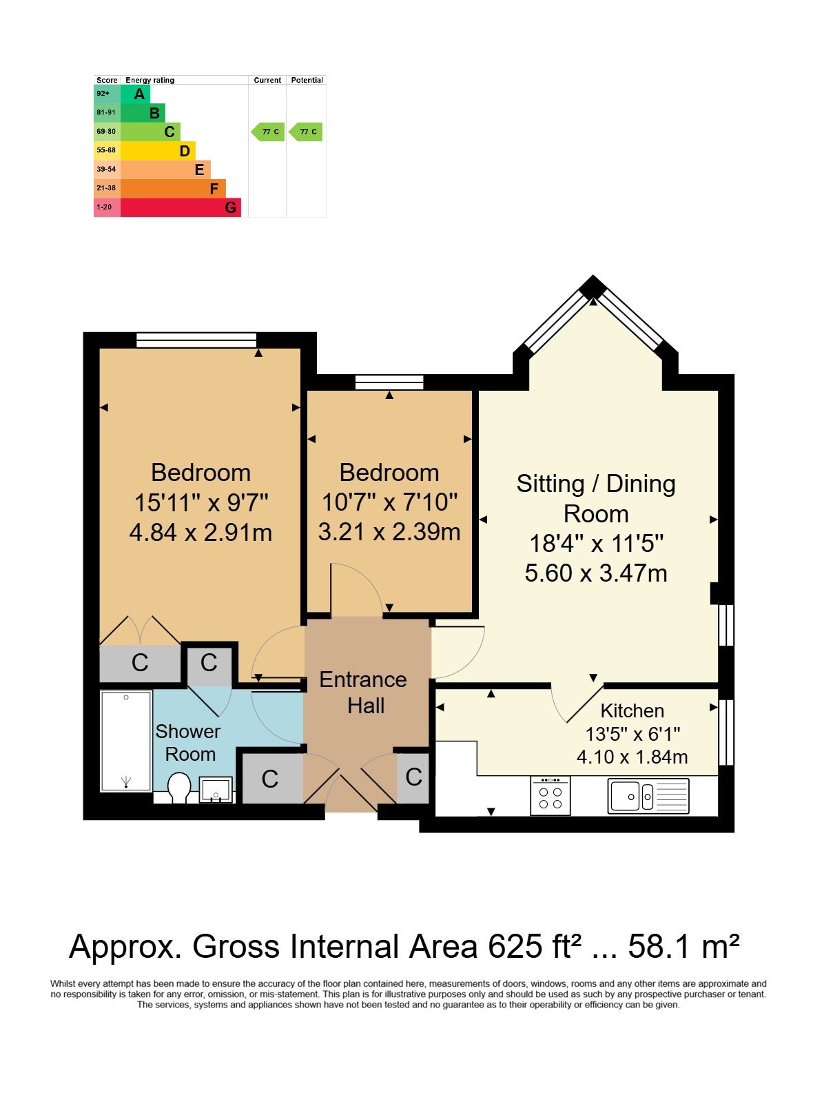 The accommodation is well laid out and benefits from good natural light throughout. The open plan living area provides clearly defined sitting and dining space, while the separate kitchen offers a practical range of units and appliance space. There are two bedrooms positioned to the rear of the building, including a double bedroom with built-in storage. The shower room has been updated with a modern walk-in shower and contemporary fittings.
